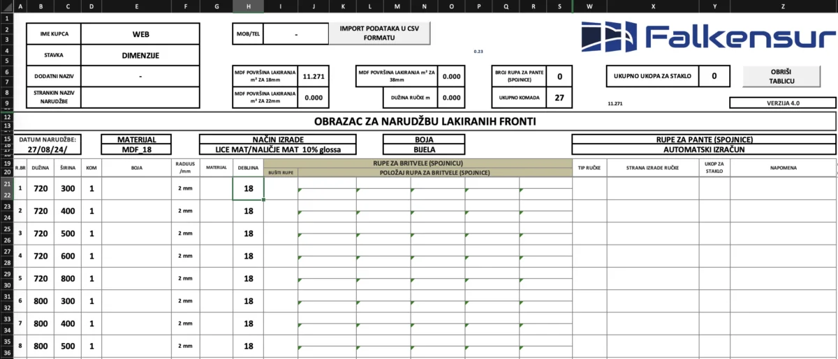 Za iskusnije kupce pripremili smo poseban Excel baziran obrazac koji omogućuje potpunu specifikaciju narudžbe s modelom fronte, debljinom, rupama, bojim itd.